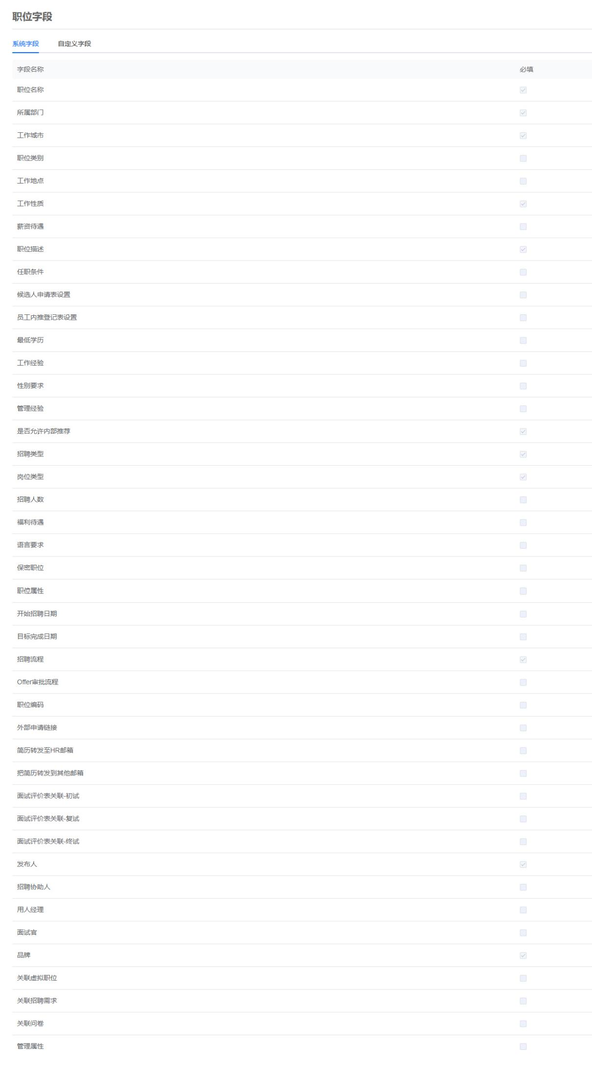 u 系统字段可配置包括:部门、城市、职位属性、工作性质、是否允许内部推荐、招聘类型、招聘流程、保密职位、开始招聘日期、目标完成日期、招聘人数、发布人、招聘协助人、用人经理、品牌