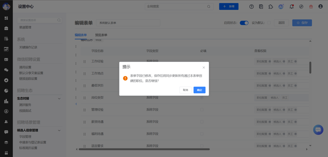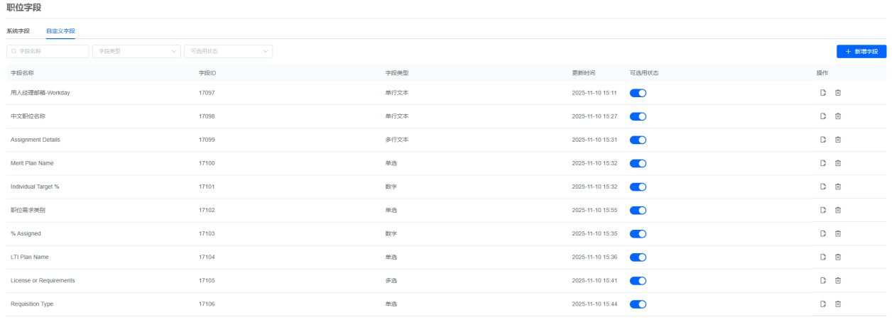 l 已有自定义字段可以删除,但有前提:需要从配置了该字段的职位表单中移除该字段,才能删除该字段,否则不能删除
