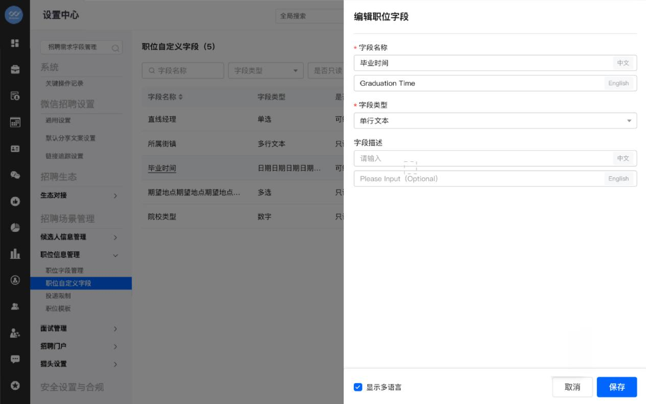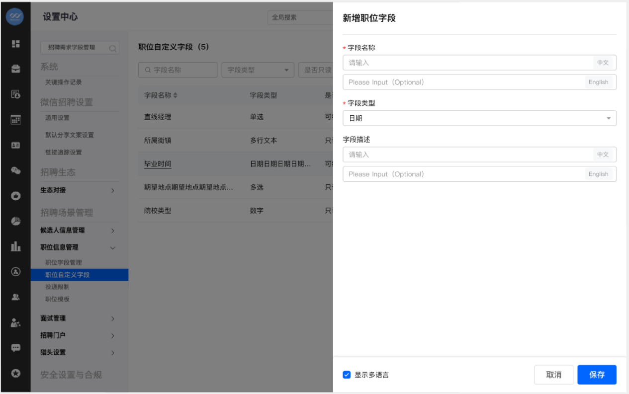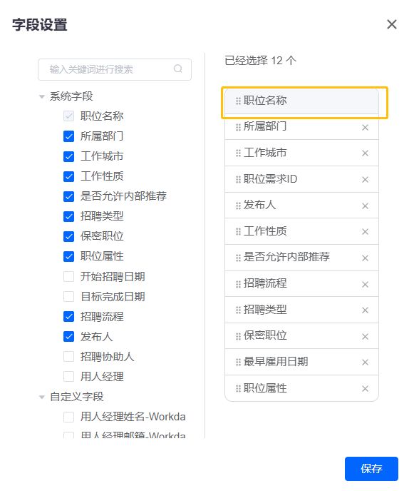 l 勾选好要的字段点击保存后,在职位管理页面左侧展示已选则的字段
