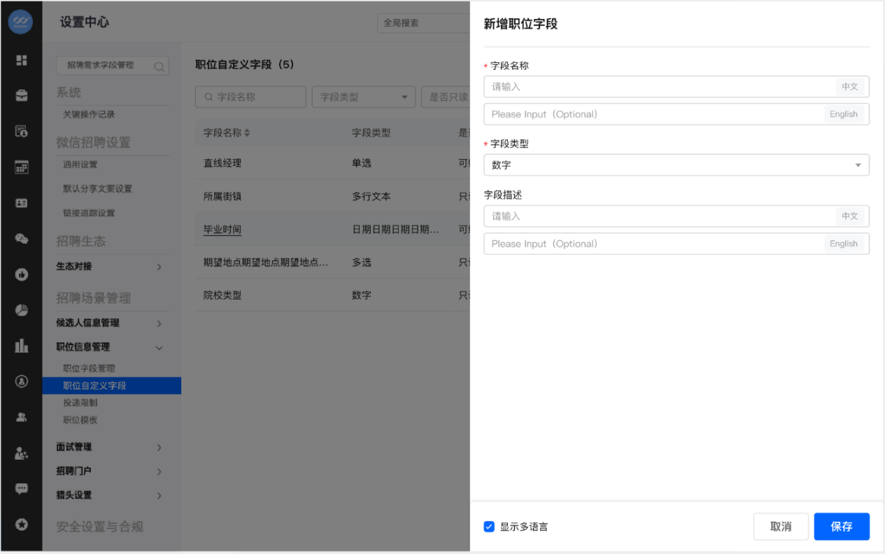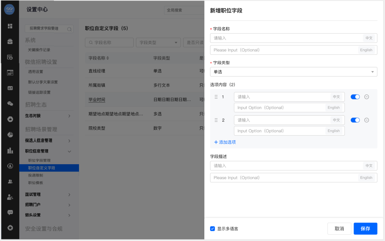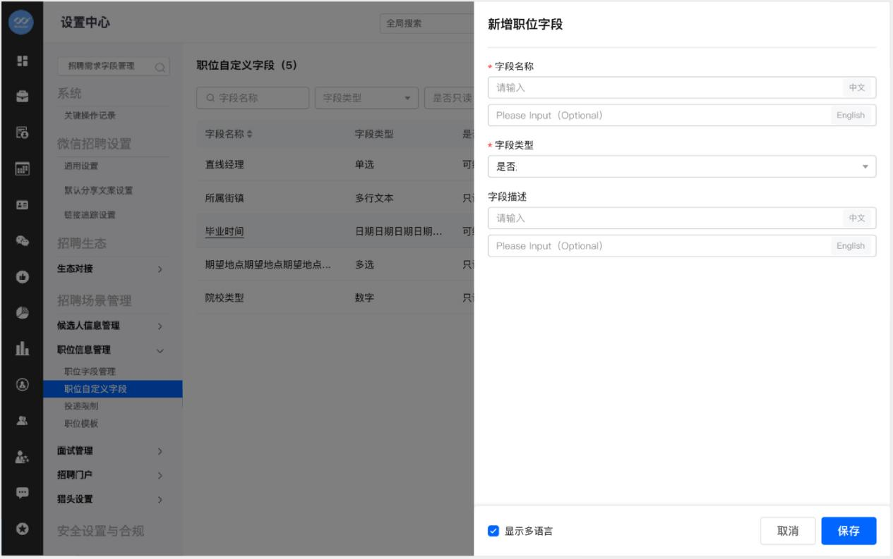 1 | 职位自定义字段 | 提供7种类型的自定义字段,用户可根据需要进行字段的创建 |