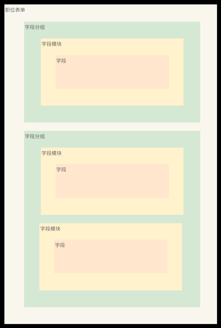 2 | 职位表单 | “职位表单”是用户在系统创建职位的基础,根据需要自主选择各种字段进行组合创建,并且支持字段的分组,以便于进行表单添加字段的管理 |