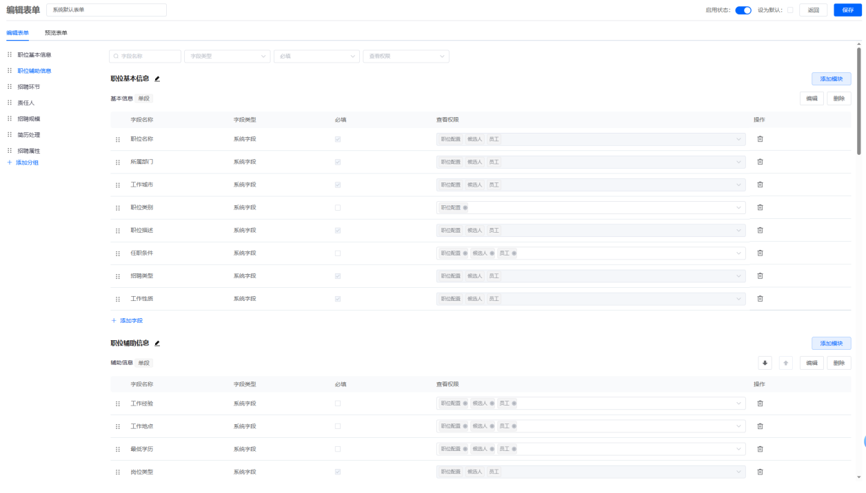 u 启用状态(显示/隐藏),此用语于控制该字段是否可以加入职位表单(目前数据结构不支持,暂不做)