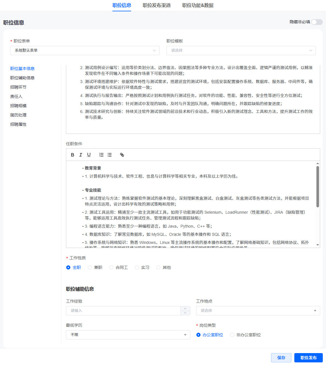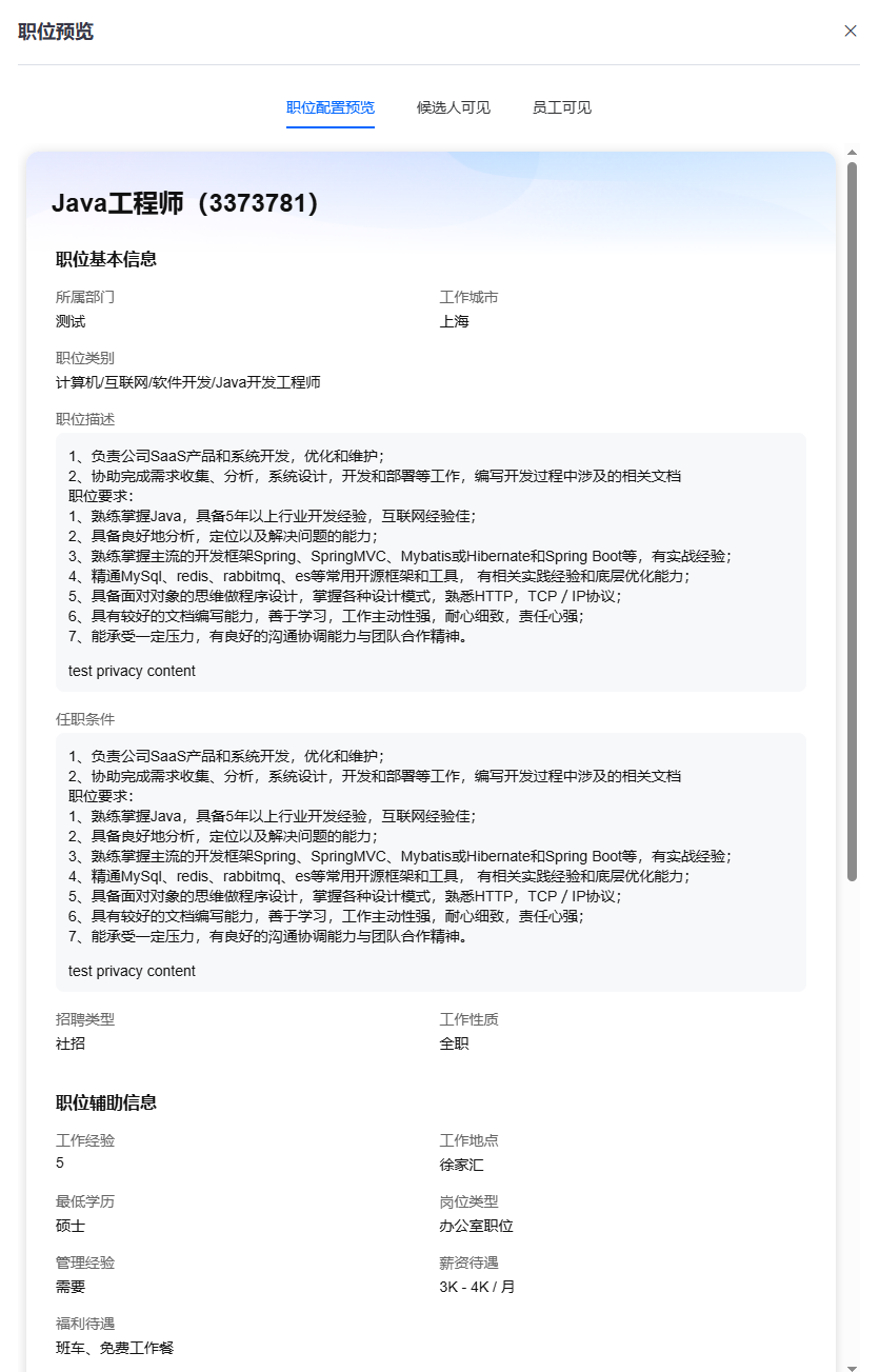 n 候选人可见:职位表单中配置了“候选人可见”的字段均显示其所选内容,没有任何编辑控制操作