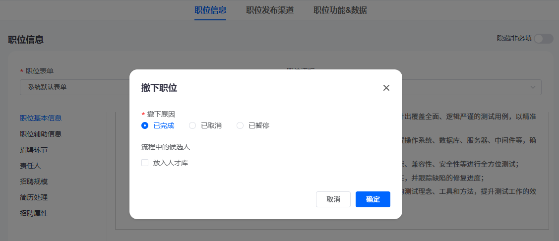 n 撤下原因:职位状态选择“已撤下”时出现,下拉单选,选项值包括:已完成、已取消、已暂停