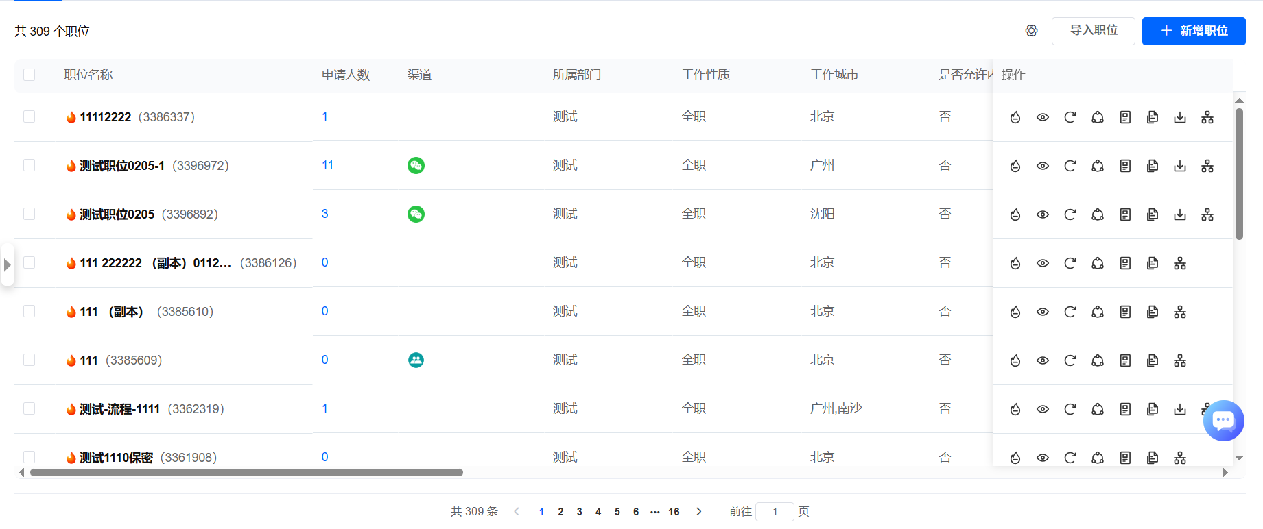 n “操作”是固定列最后显示,其他列显示在“职位名称”“申请人数”“渠道”和“职位状态”“发布时间”“操作时间”“发布人”“职位表单”之间,如果超过页面宽度,出现横线滚动条