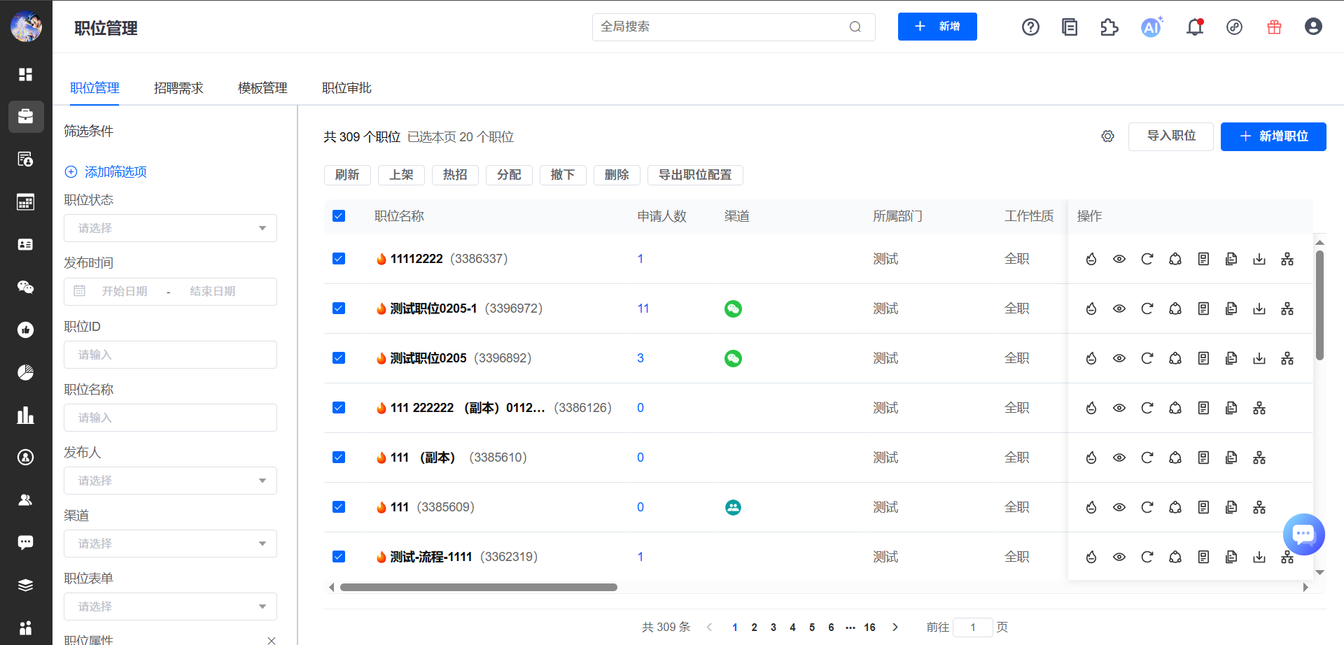 7 | 职位发布渠道 | 可以选择第三方渠道、微信、仟寻网站、猎头、内部招聘作为候选人申请的来源 |