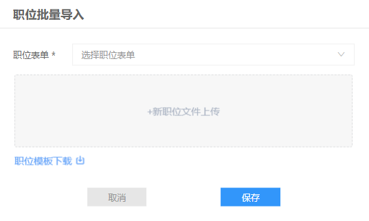 - 点击“批量导入”按钮后弹出导入弹窗,用户先选择职位表单,然后显示出下载导入模版以及上传模版的字段