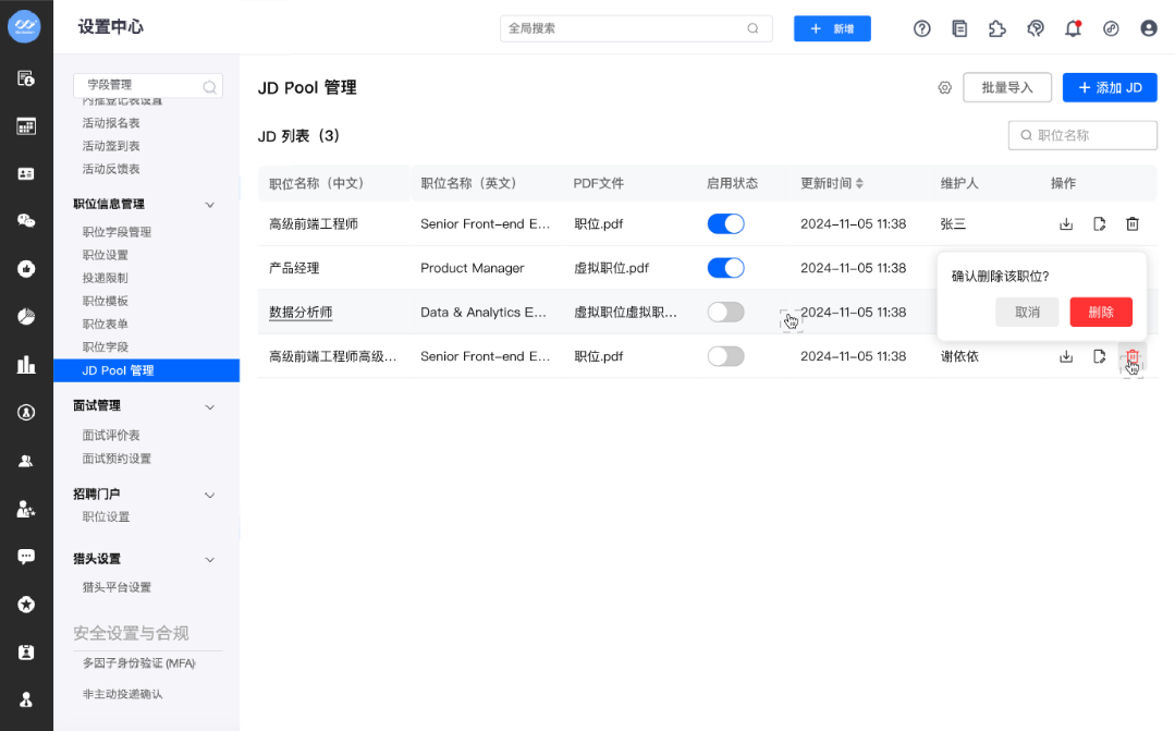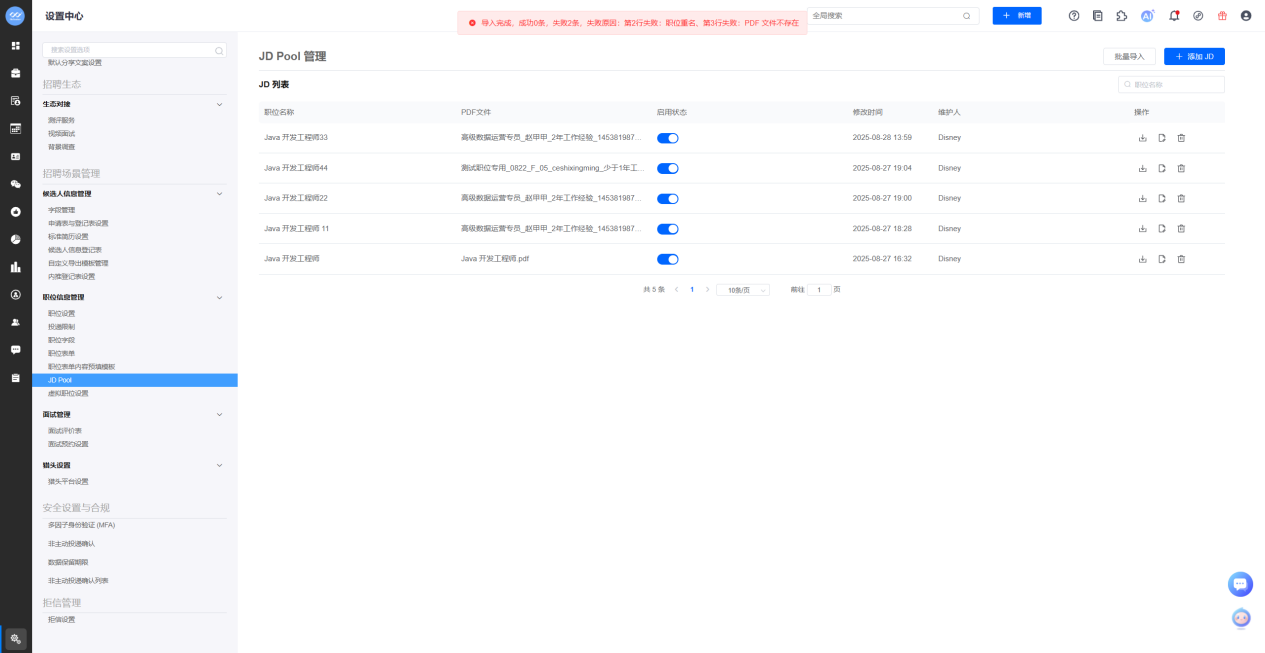 JD Pool 用于集中管理公司各职位的职位描述(JD)相关信息,方便招聘相关人员进行查看、维护、更新等操作
