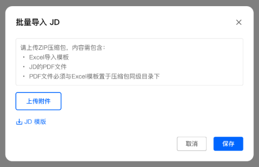 l 点击“批量导入”按钮,可导入 zip 文件,一次批量上传一个zip文件,文件中为 Excle 模版以及所有 JD 的 PDF 文件,PDF 必须与 Excle 模版 在同一层级文档,导入时引用 Excle 文档信息调用 PDF 文件上传入系统