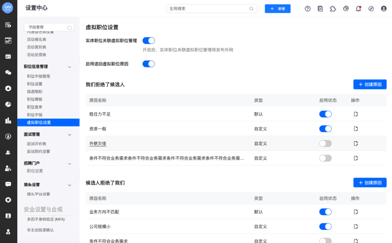 n 开启后,可以配置“我们拒绝了候选人”、“候选人拒绝了我们”两个模块的配置,每个模块可以定义原因