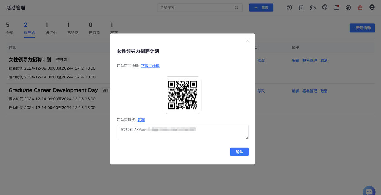 落地页配置可使用“招聘门户”配置的所有功能,并新增模块:活动信息 & 报名模块
