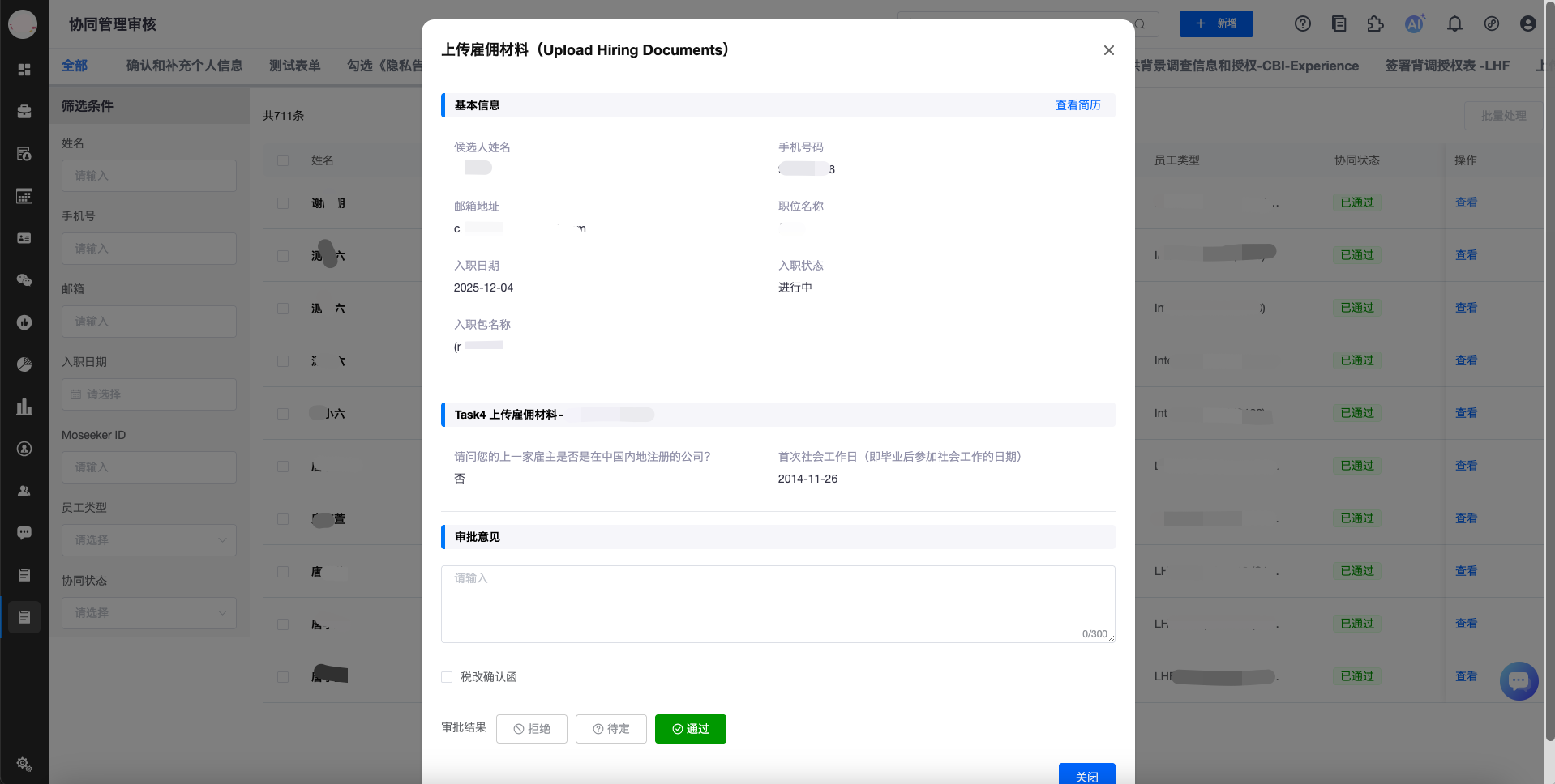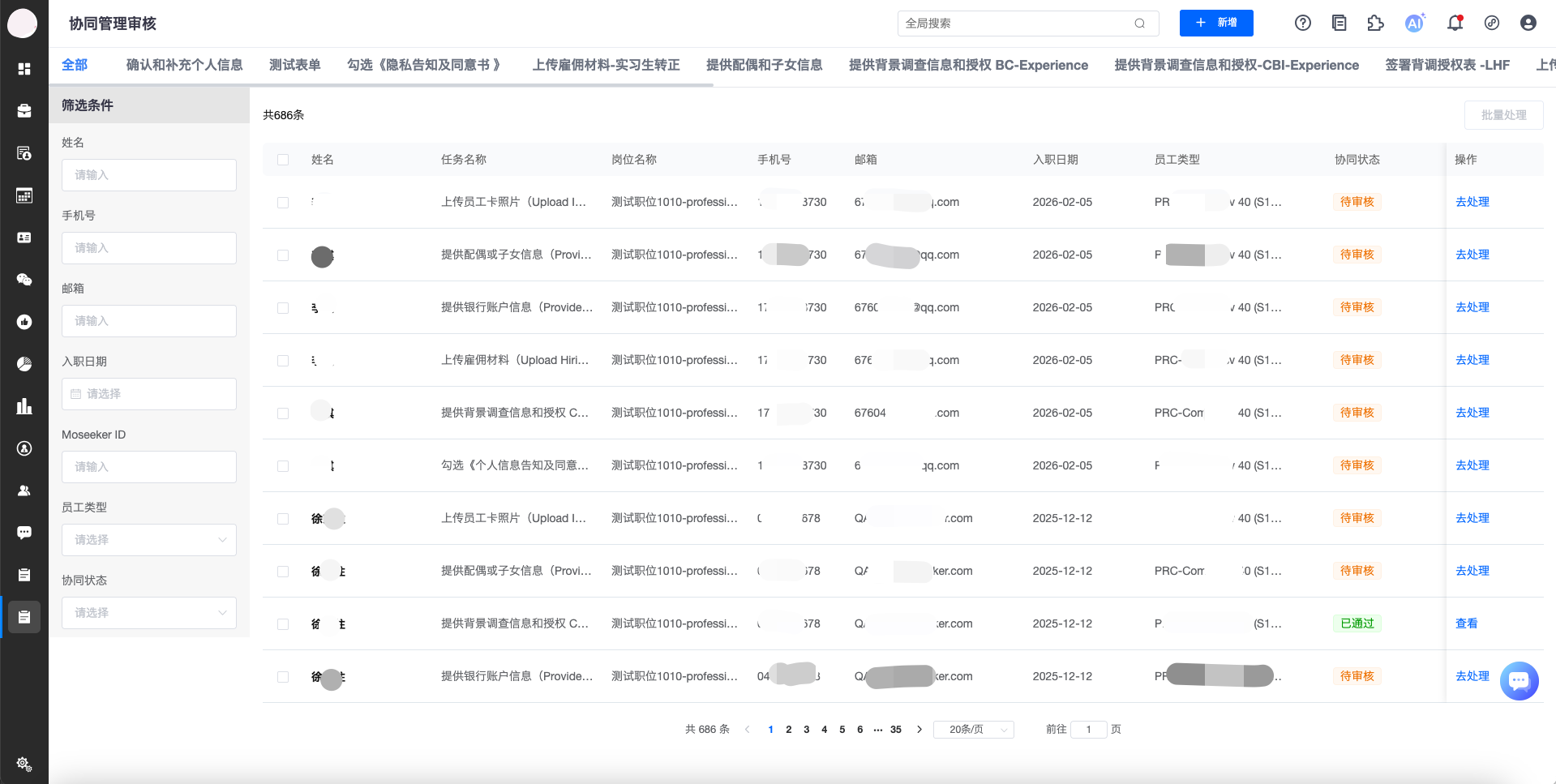 以列表形式呈现员工入职关键信息,包含姓名、入职日期、用工类型、协同状态(如待审核)、入职状态(如入职中 ),清晰展示审批进度,让流程状态一目了然,便于实时跟踪与管理。
