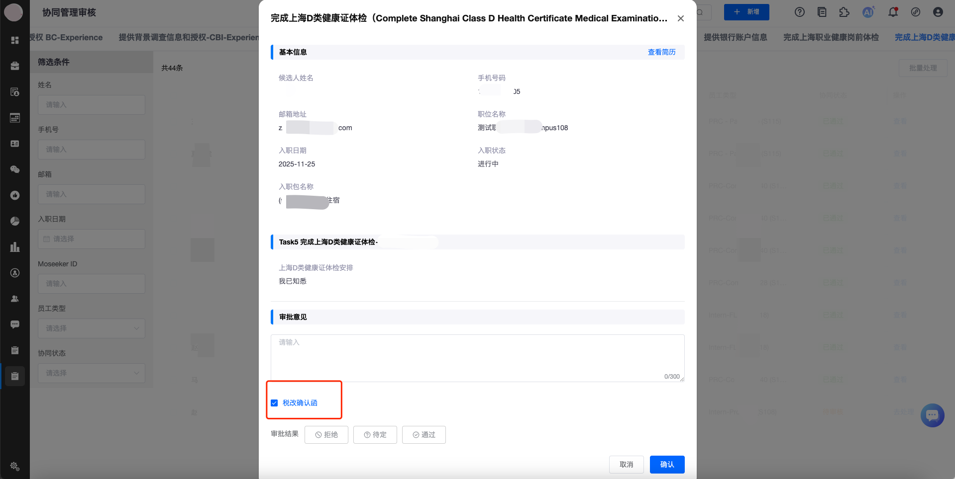 审批结果同步:税改确认函的任务需要同步到入职信息表单(待入职信息表单开发完后补充)
