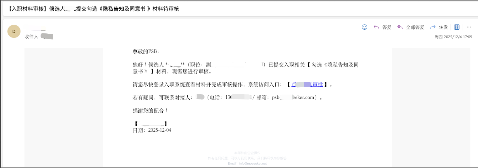 通知渠道:同时发送邮件、短信(需候选人提前绑定手机号)。