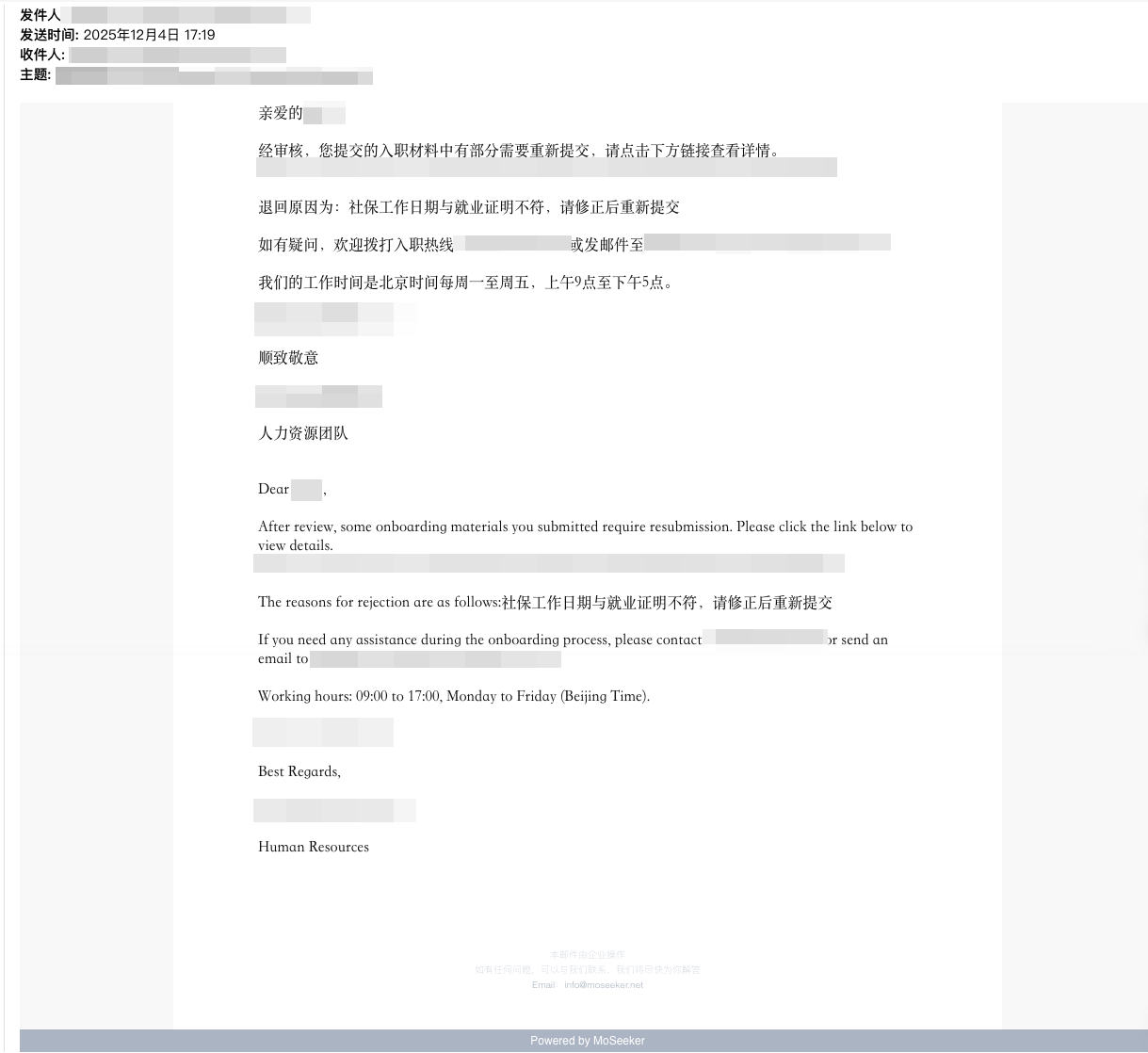 通知内容:包含审批环节名称、拒绝理由、需修正字段高亮显示,如 "FSG 审批拒绝:社保工作日期与就业证明不符,请修正后重新提交"。