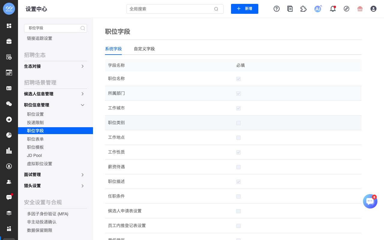 l 系统字段,共39个,在字段管理中不可进行编辑(招聘流程在候选人端,是以用户中心的职位投递记录的 Step 形式展示)