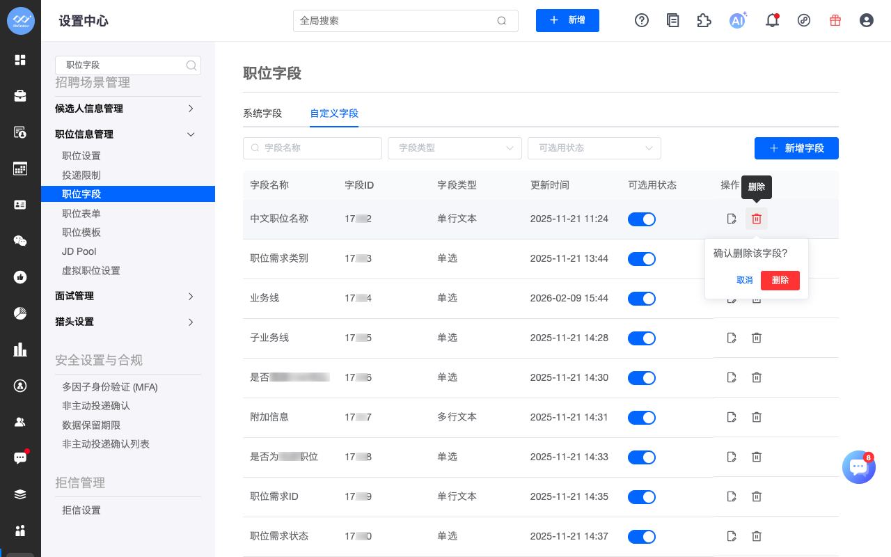 l 已有自定义字段可以删除,但有前提:需要从配置了该字段的职位表单中移除该字段,才能删除该字段,否则不能删除