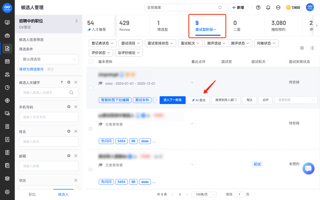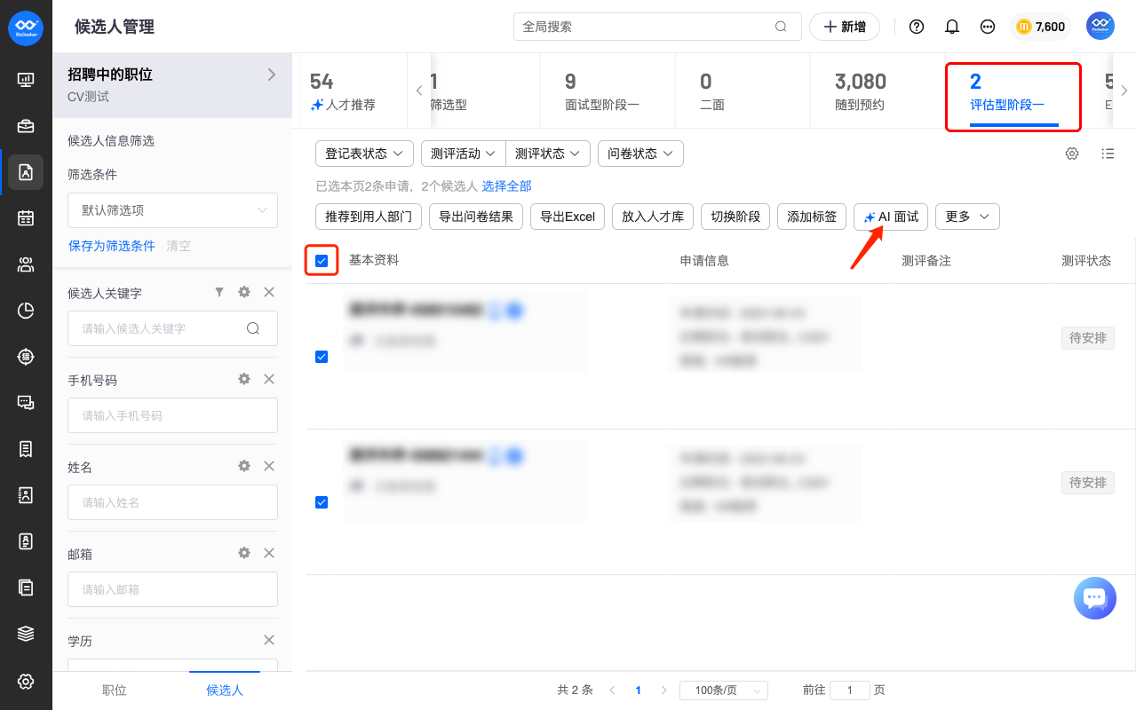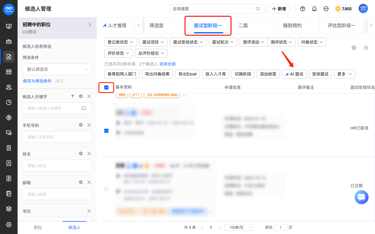 职位列表页:当候选人阶段为“面试型”或者“测评型”阶段时,同时选择多位候选人,勾选后展示“✨AI面试”按钮,进行批量AI面试创建;