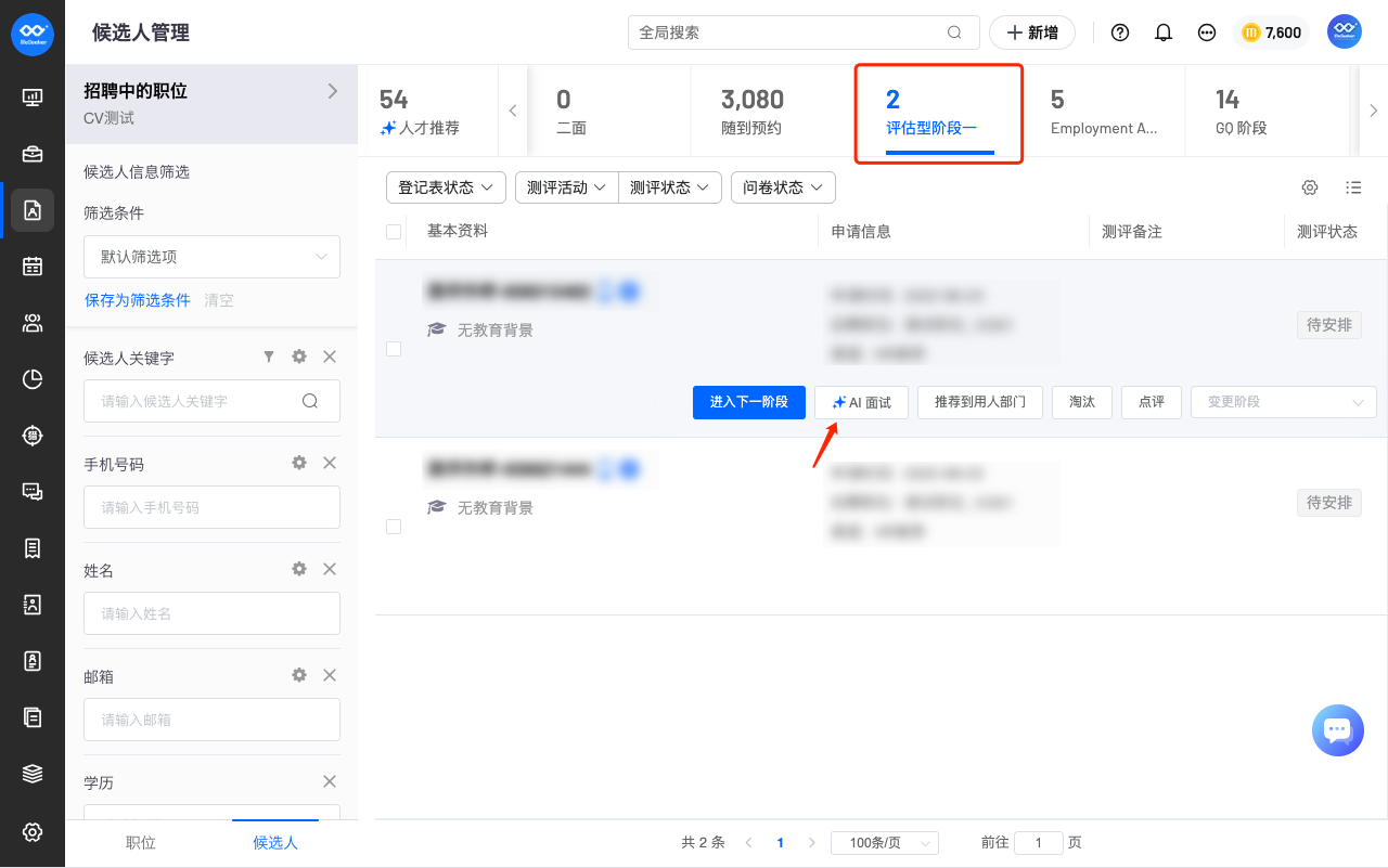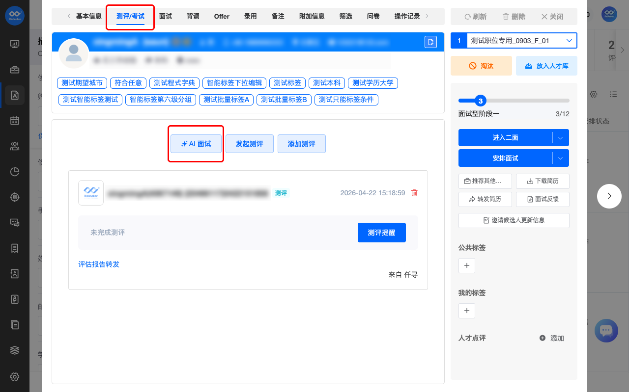 候选人详情页:“测评/考试”Tab页新增“✨AI面试”按钮,点击即可启动流程。