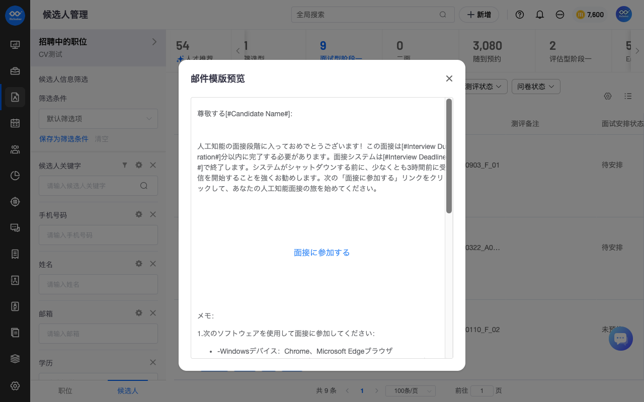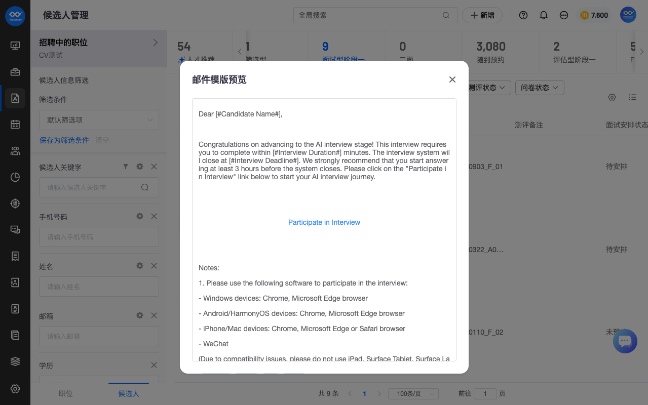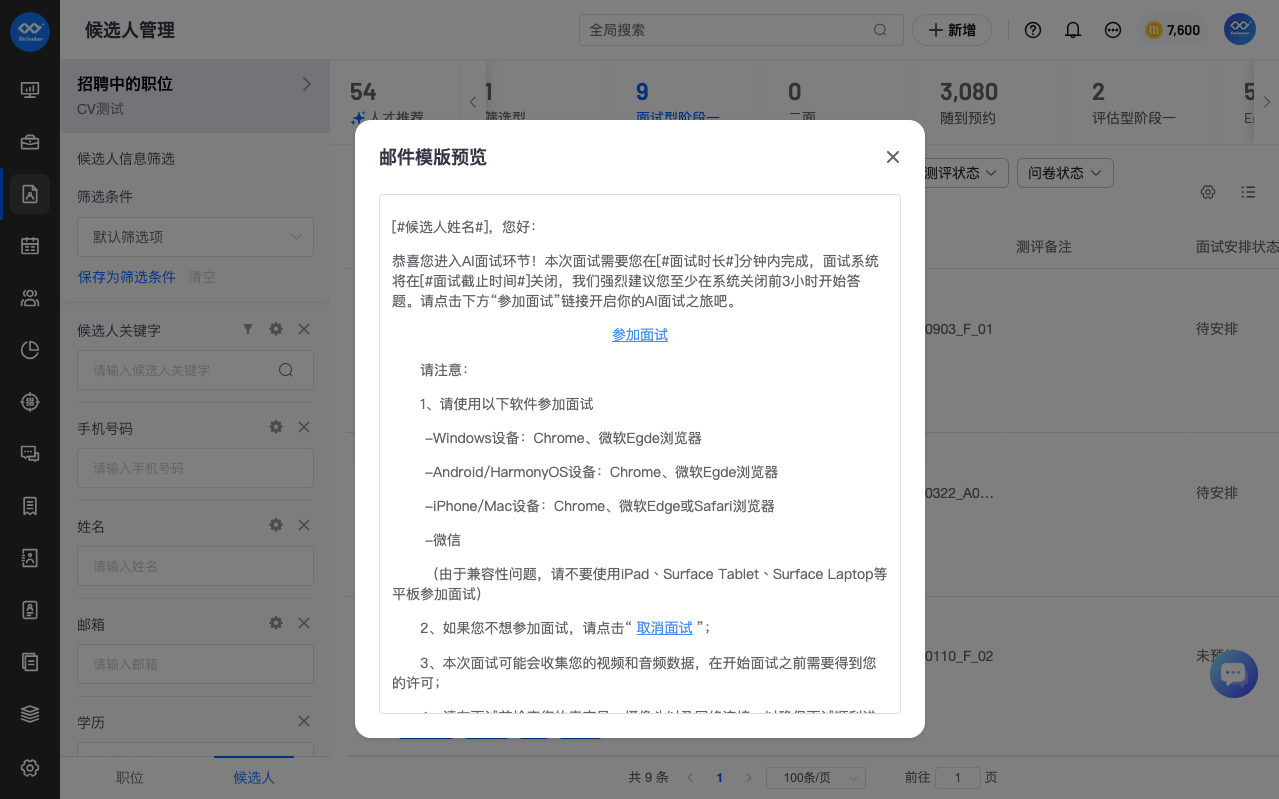 重复创建:同一候选人、同一职位申请再次发起✨AI面试时,系统将重新生成新试题,保障考察的全面性。