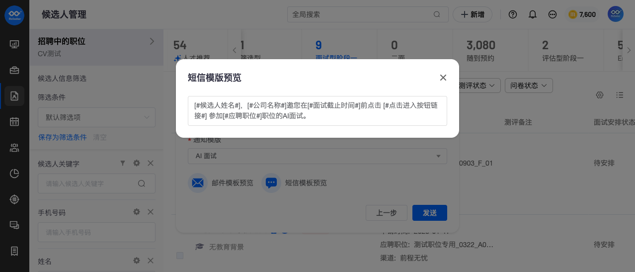 选了模板后,根据所选模板的“邀请面试”消息在邮件、短信是否打开,显示邮件、短信的预览icon,点击对应icon弹出邮件或短信的预览弹窗