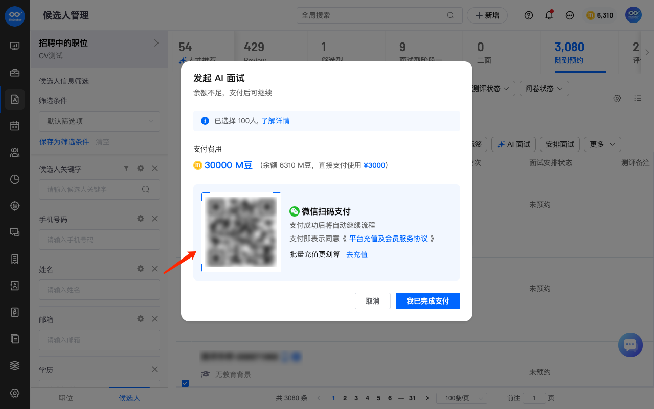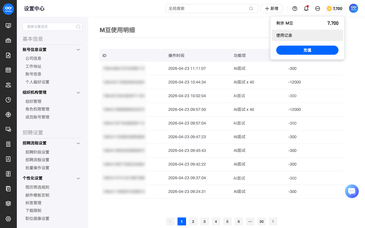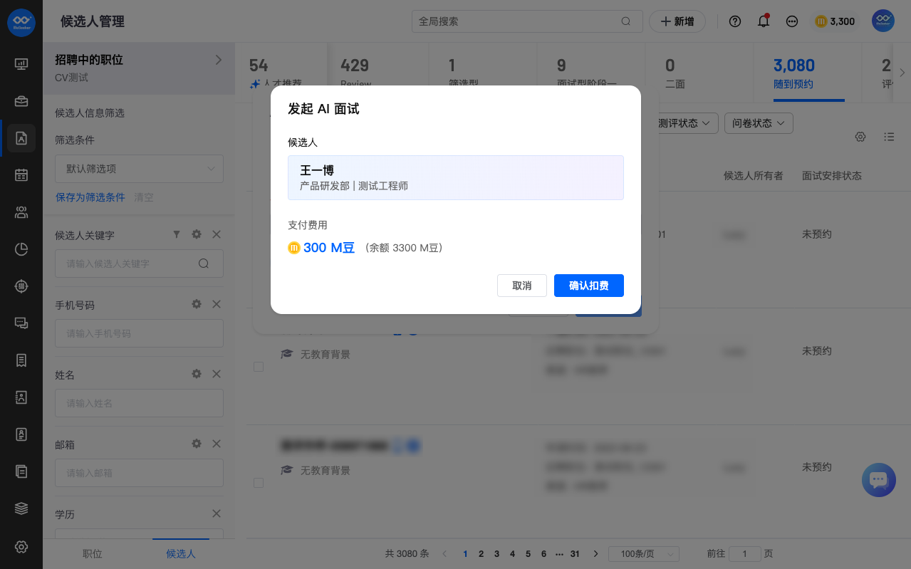 收费标准:单人单次✨AI 面试消耗 300 M 豆;批量发起按候选人人数累计扣费,计费清晰统一。