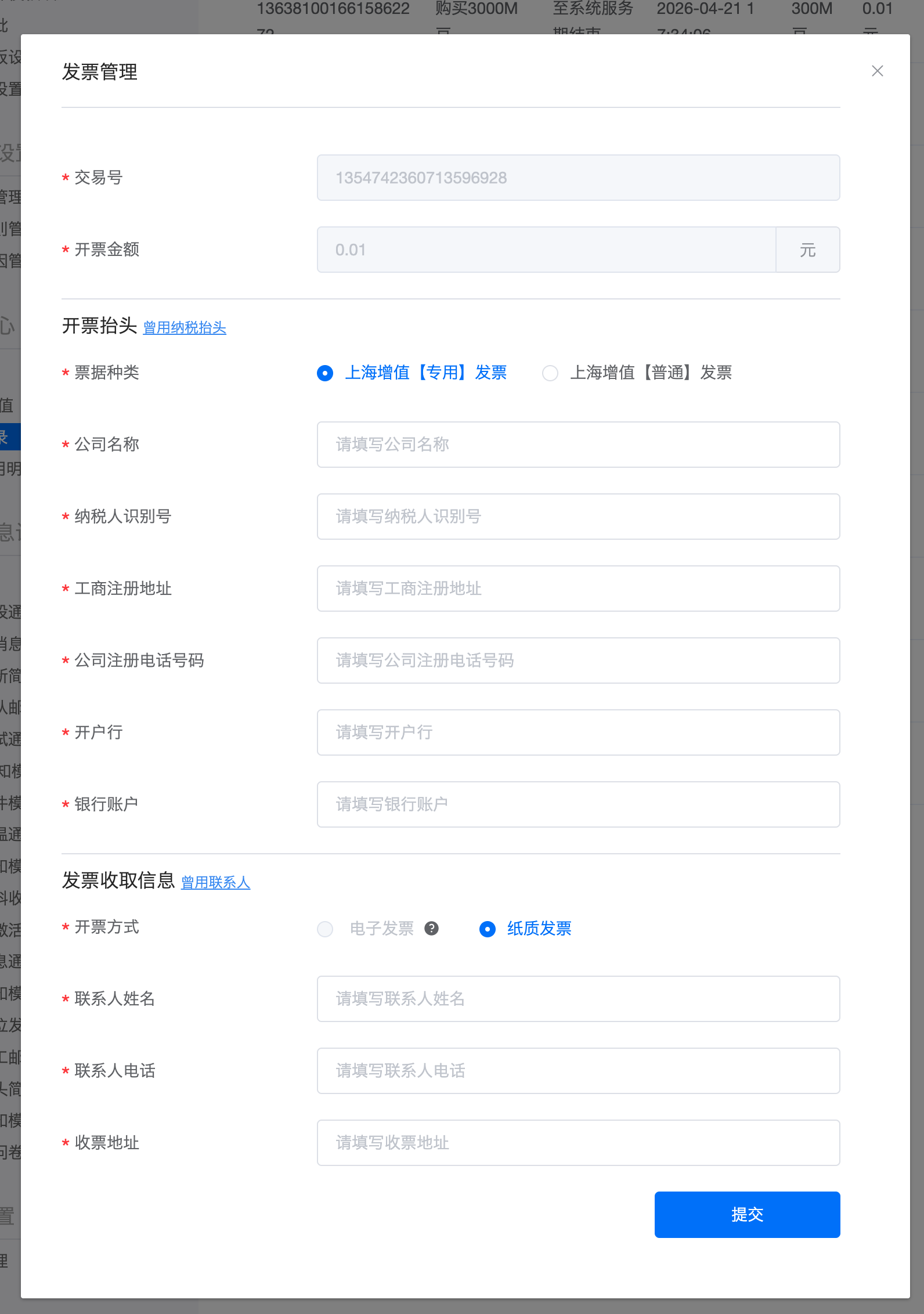 发起申请:点击“发票管理”,提交开票信息,随后进入仟寻财务审核流程。