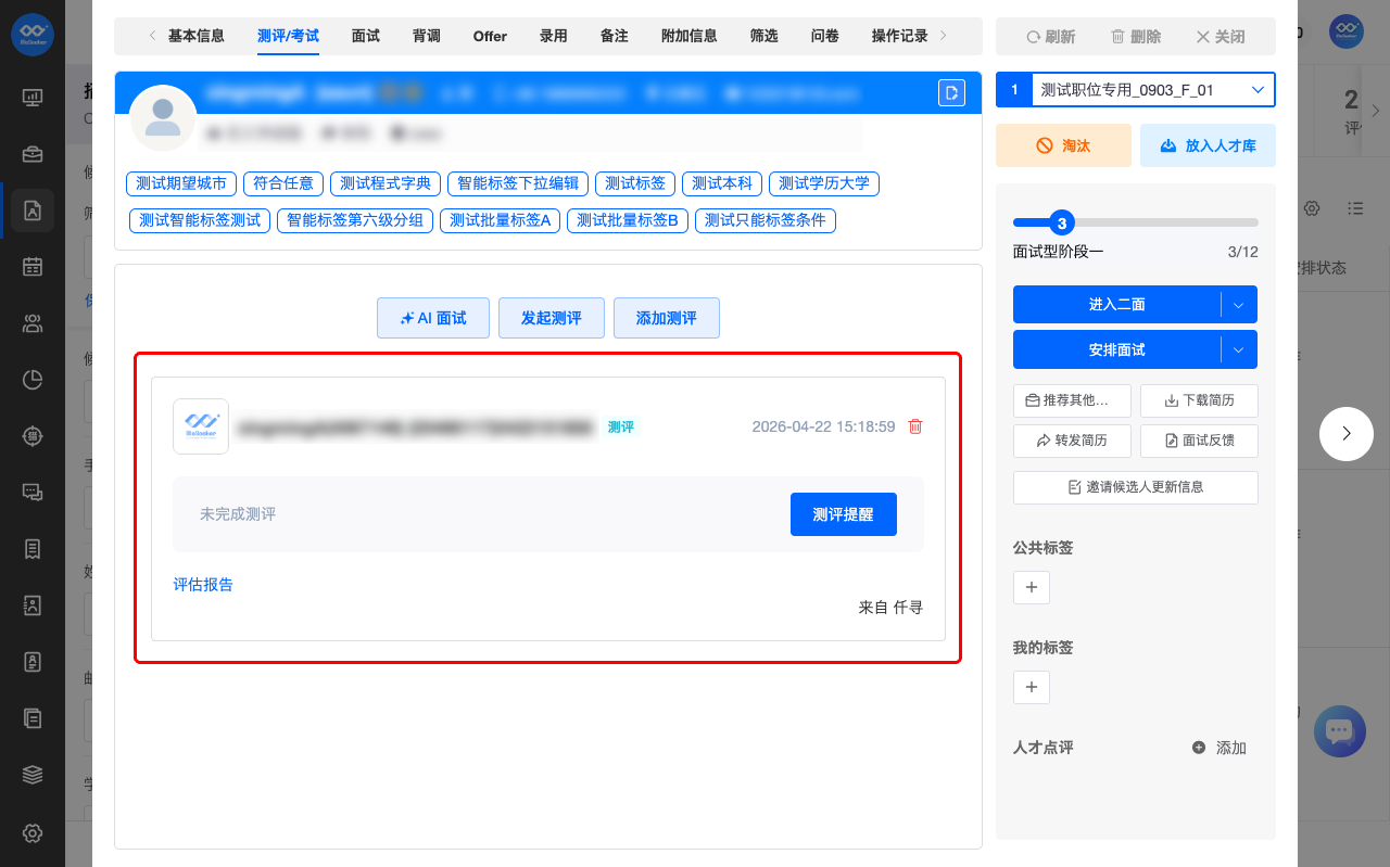在候选人“测评/考试” Tab 下生成任务卡片,同时候选人的测评状态变成“未完成测评”;