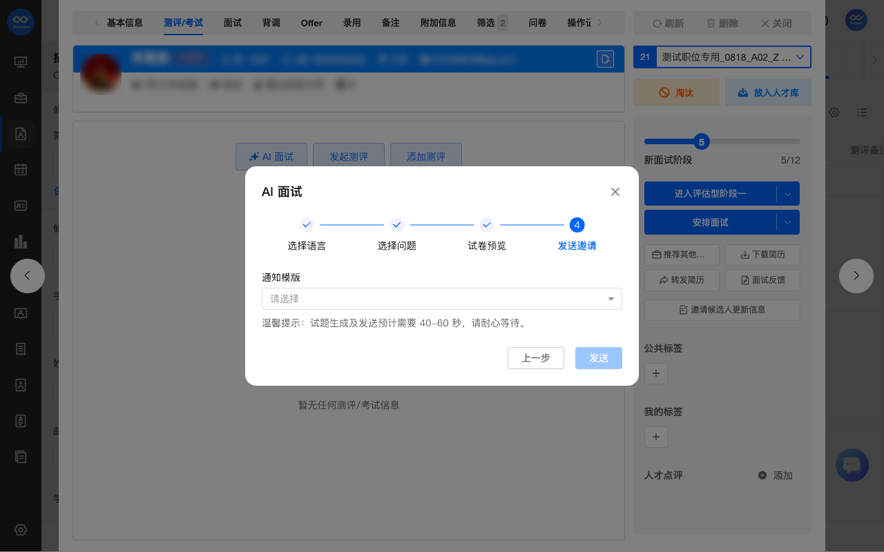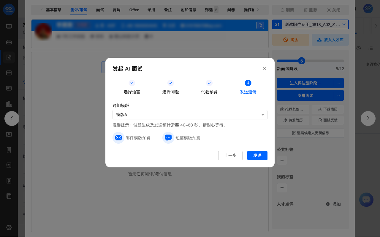 Step 4:发送邀请,需要先选择通知模板,这里下拉列表中的选项就是 AISaaS 中 AI 面试的所有通知模版。在没有选择模板前“发送”按钮是置灰不可点状态;