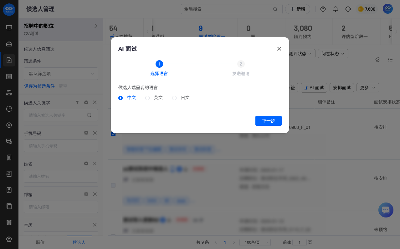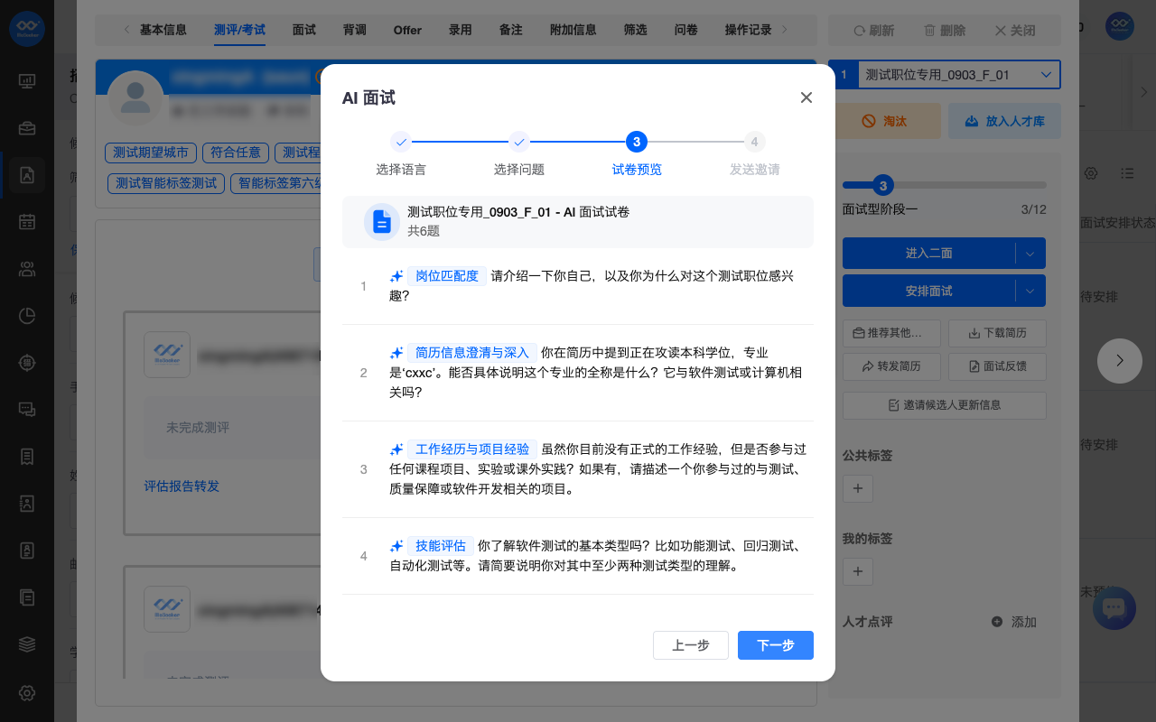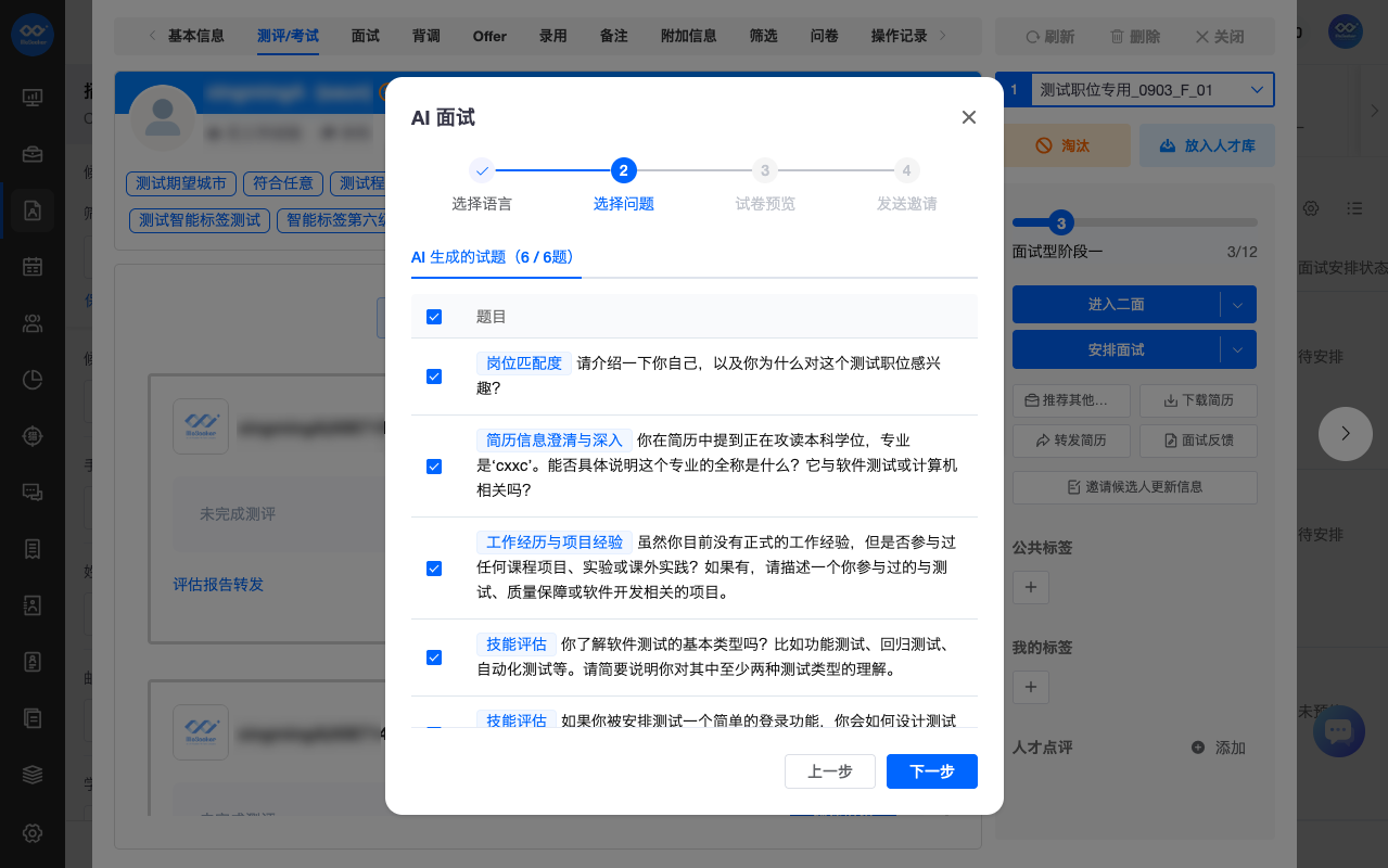 批量操作中的“✨AI 面试”,弹出创建弹窗只有两个Step: