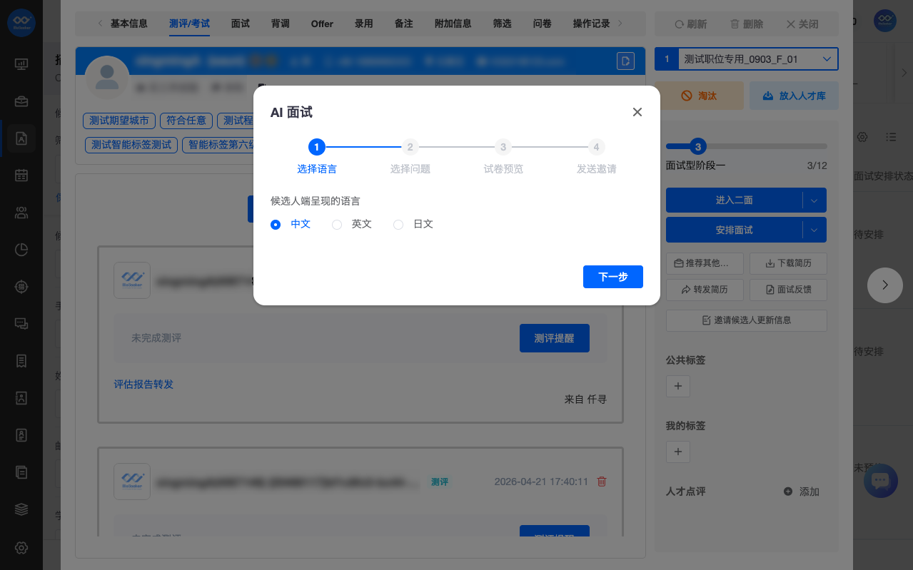 Step 1:支持中文、英语、日语三种面试语言,语言选择将同步适配候选人看到的界面与试题语言;