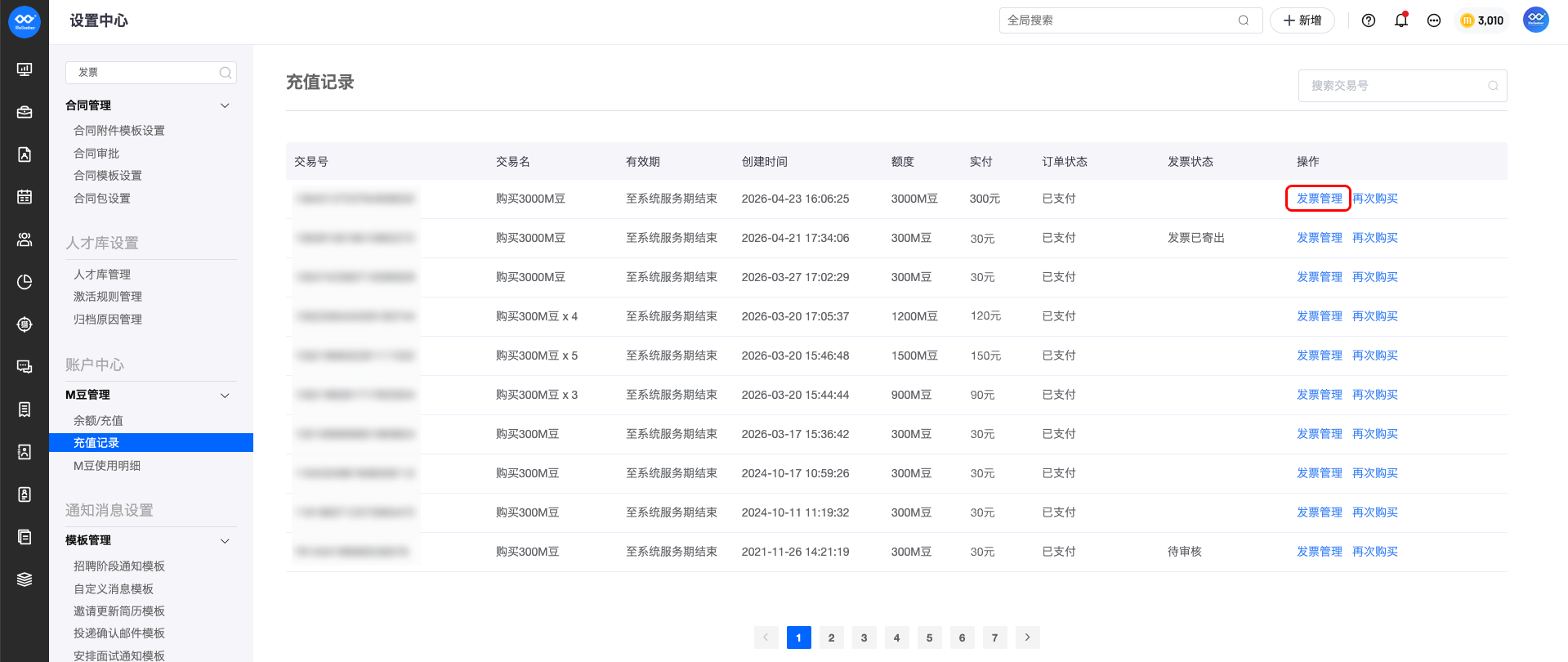 设置中心 > 账户中心 > M 豆管理 > 充值记录